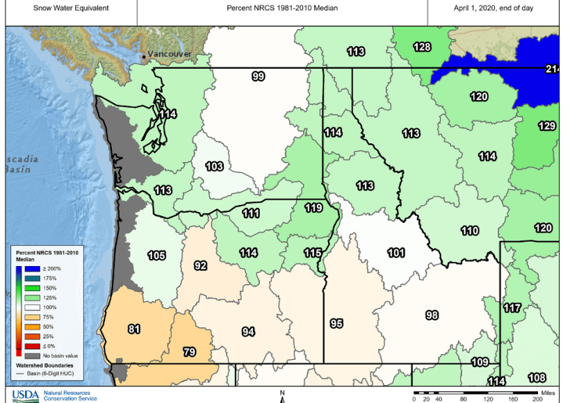 There were some sub-basins with closer to 70%-80% of average SWE amounts on the east side of the Cascades and in central Idaho, while parts of the western Cascades, Blue Mountains, and Idaho panhandle saw over 120% of their typical SWE amount.