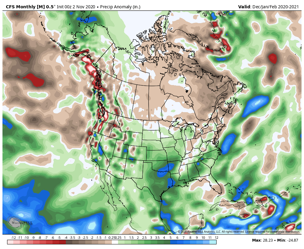 According to the CFSv2, the cold+dry pattern is a consequence of a trough of epic proportions along the west coast of North America in January-February.
