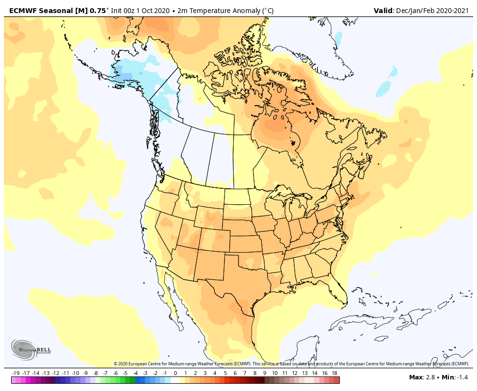 The ECMWF could not be any more different than the CFSv2. Above-normal temperatures nearly everywhere, including most of the PNW: