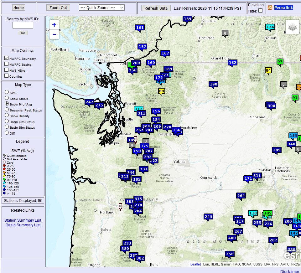 Notably, this is a much earlier start to the snow season than last winter. At Olallie Meadows SNOTEL site (near Snoqualmie Pass) the snow water equivalent (SWE) and snow depth amounts measured on the morning of 11/15 weren’t reached until December 19 in 2019. The Mt. Hood site didn’t match Sunday’s snow amounts until early January 2020. SWE amounts are generally between 100-300% of average for the date across Oregon and Washington mountain ranges. Whether you care about skiing, snowball fights, or water resources, this weekend was an encouraging start to the season.