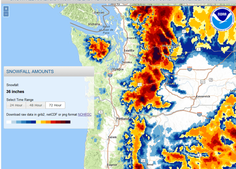 Active weather indeed. From Mt. Hood to Mt. Baker and beyond, ski areas across the northwest built a considerable base. Snoqualmie Pass went into the weekend with just a few inches of snow on the ground and now, as of Sunday morning, has 26” of snow depth. Aforementioned Baker and Hood have 47” and 44”, respectively. The Cascades were not the only range to experience significant snowfall, with notable totals also occurring in the Olympics, eastern Oregon, and mountains of northeastern Washington and northern Idaho.