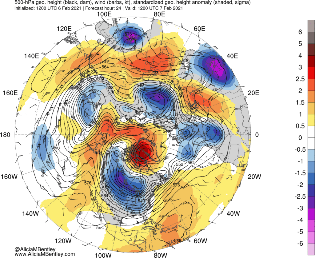 The first key feature is the big red blob over Greenland, a blocking area of high pressure which has induced easterly (backwards) flow over northern Canada. A second helpful feature is the ridge of high pressure over the northern Pacific into Alaska. Since air masses flow around these features, a pathway is open to funnel arctic air directly from Siberia across the North Pole and into southern Canada and the US.