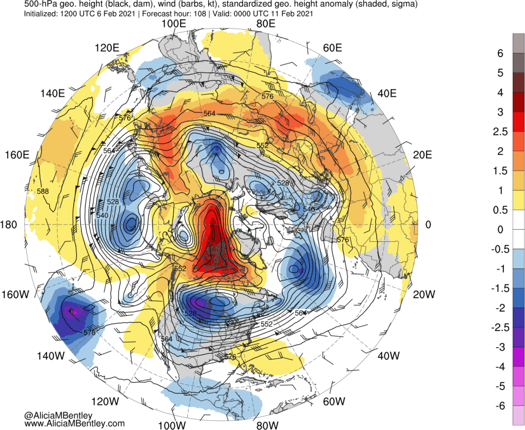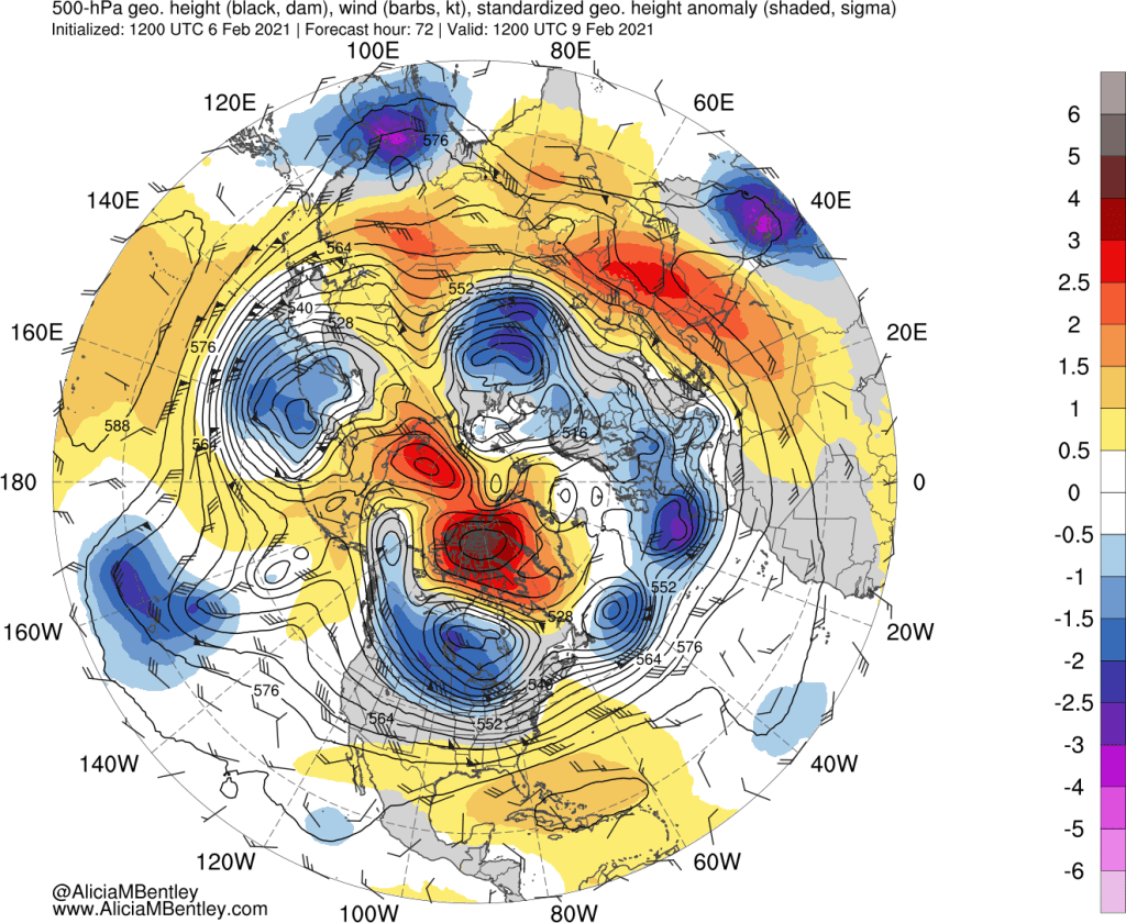 The two blocking orange/red high pressure features I noted above are both expected to remain present–in fact they should begin to merge into a single, large blocking feature. By Wednesday evening, the transformation should be complete.