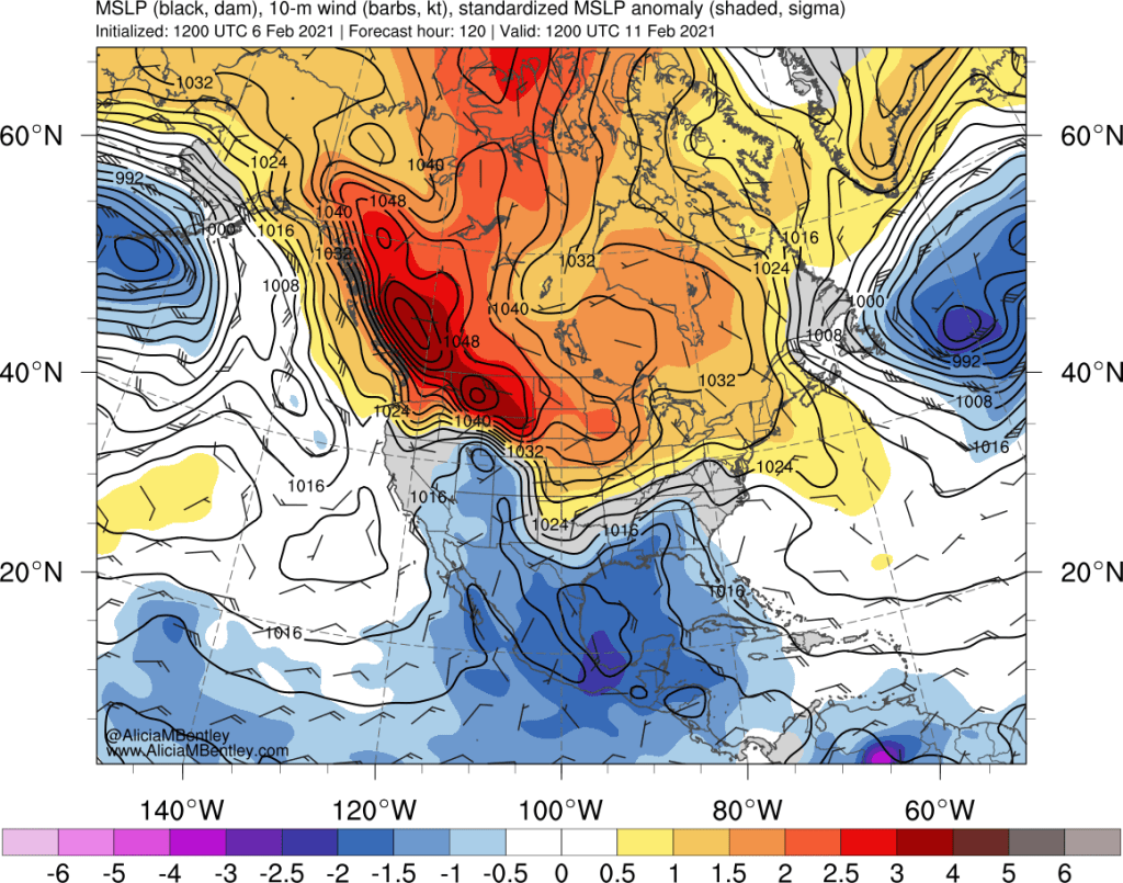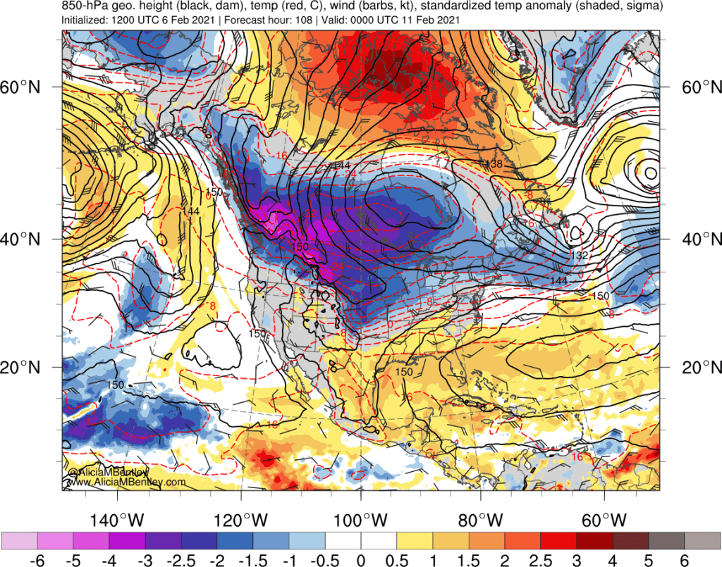 While your eyes might be initially drawn to the blue/purples representing anomalously cold air, two key features on this map are actually orange and red in color.