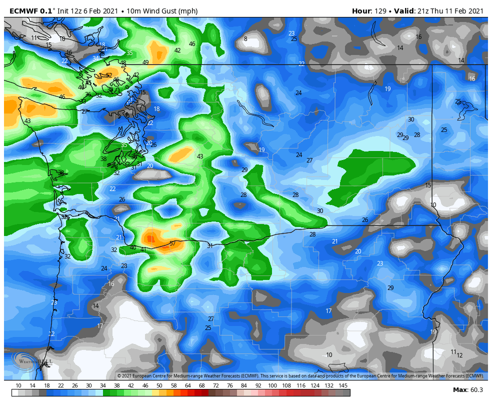 Even without a corresponding low pressure center offshore, there will still be a strong pressure gradient through the Fraser and Cascade gaps by Thursday. It’s a little early to speculate on wind speeds but a quick look at the ECMWF shows 40-50+ mph wind gusts will be possible.
