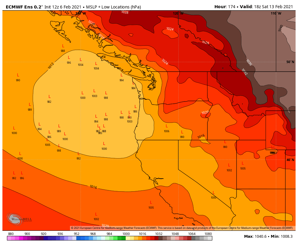 However, a few weather systems might make an attempt at approaching from underneath the ridge, straight from the west or west-northwest. There’s no point in going into details at this time since the ensembles are all over the place. For instance, the ECMWF ensemble ‘low locations’ plot suggests the possibility of a low pressure system approaching the PNW next Saturday, but no consensus or even clustering of a preferred track.