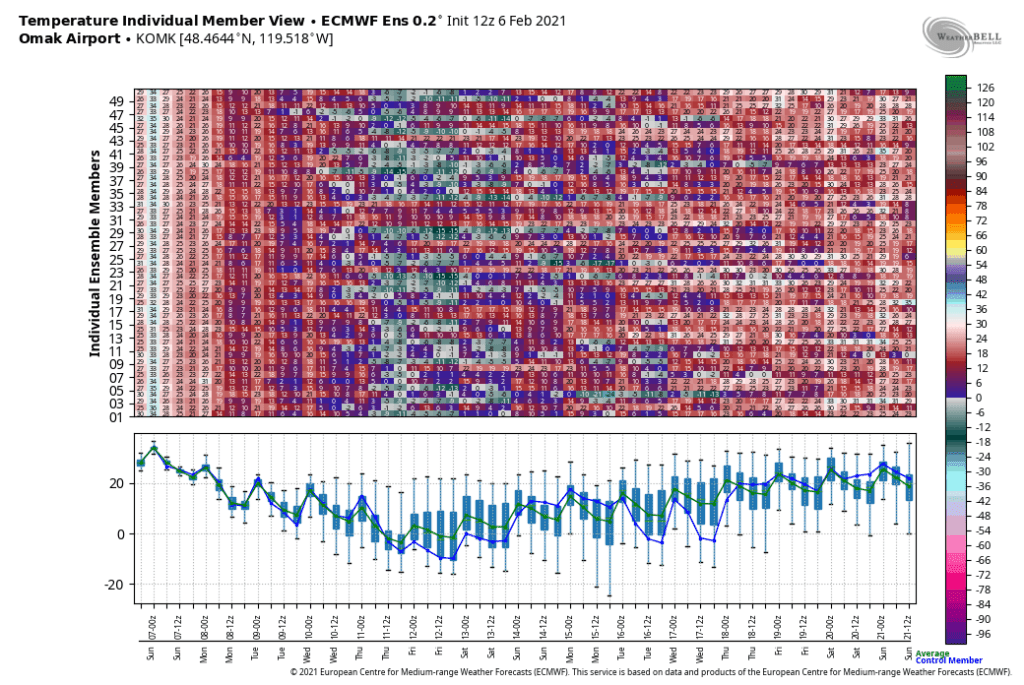 For the real cold, just head east of the Cascades to Omak, where many ensemble members have temperatures below zero F.