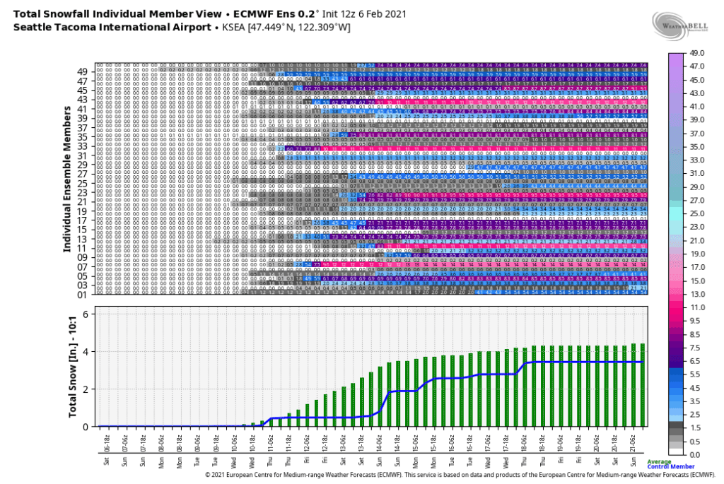 It would be a real waste of an impressive arctic air outbreak to not get any snow. The ECMWF ensemble mean for Seattle is 4 inches of snow, but there is a near 50/50 split on whether there will be just a few flakes or a decent snow event sometime late next week into next weekend. The GFS ensemble (not pictured) is a little more pessimistic with about 1/3 of members showing widespread accumulating snowfall.