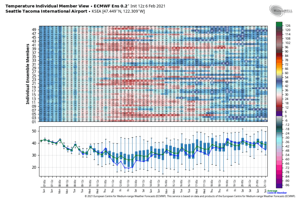 Next Friday-Saturday look like the coldest mornings. The latest ECMWF ensembles show a mean in the mid-20s for Sea-Tac airport on Friday and Saturday mornings.