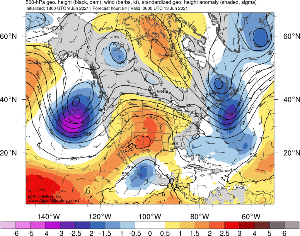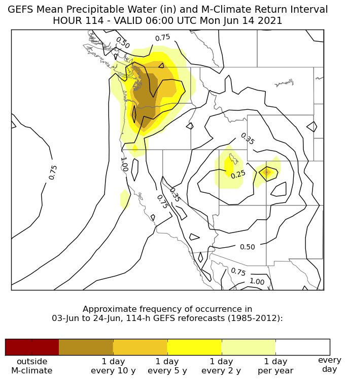 It’s a little bit easier to think of this event in terms of a “return interval” which is estimated to be one day in every 10 years for this level of forecast precipitable water in June.