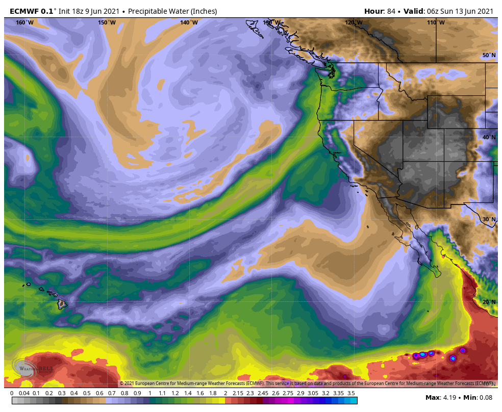 This trough is deeper than the one that brought clouds and rain to the PNW last weekend and is associated with an unusually strong jet stream for late June. But what is really impressive about this upcoming series of storms is how much moisture they are expected to pull in from the subtropics.