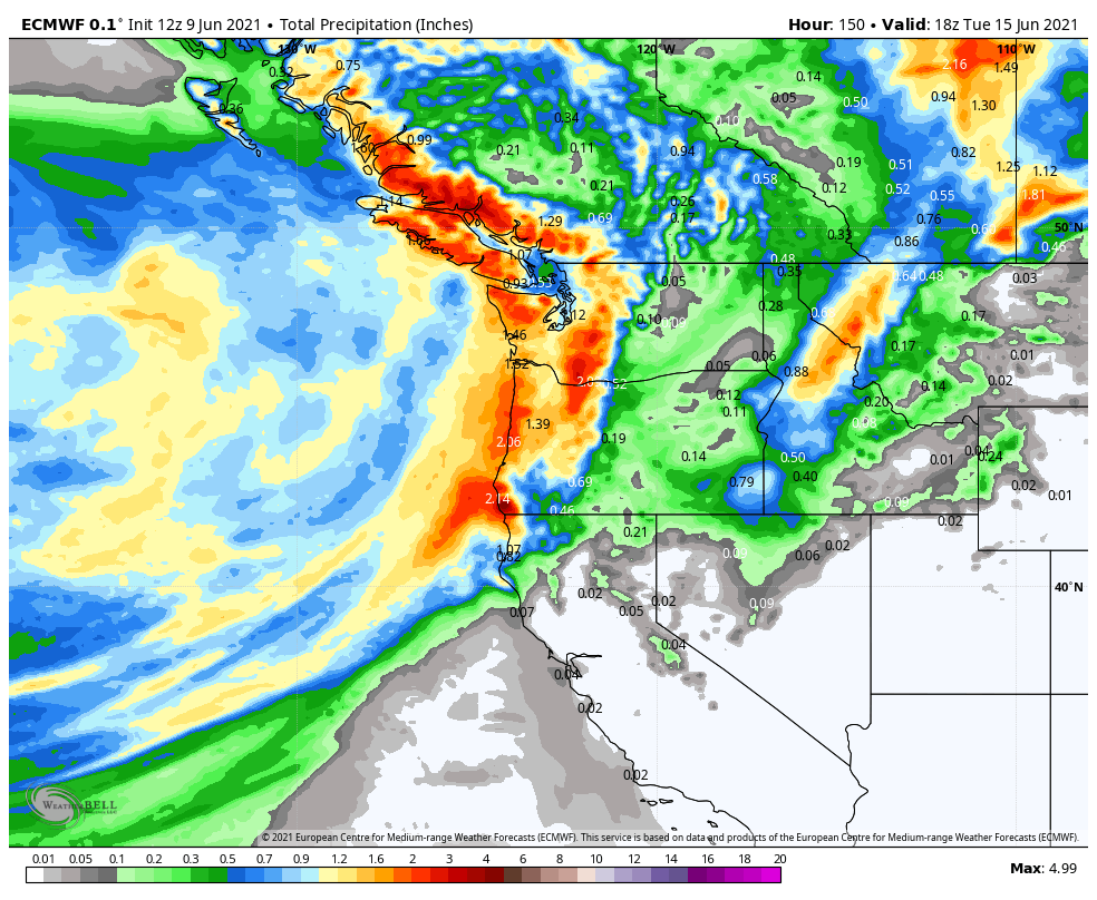 Through Tuesday afternoon the deterministic ECMWF shows around an inch of precipitation in the western WA/OR lowlands with up to 2 inches in the mountains. Impressive numbers for mid-June.