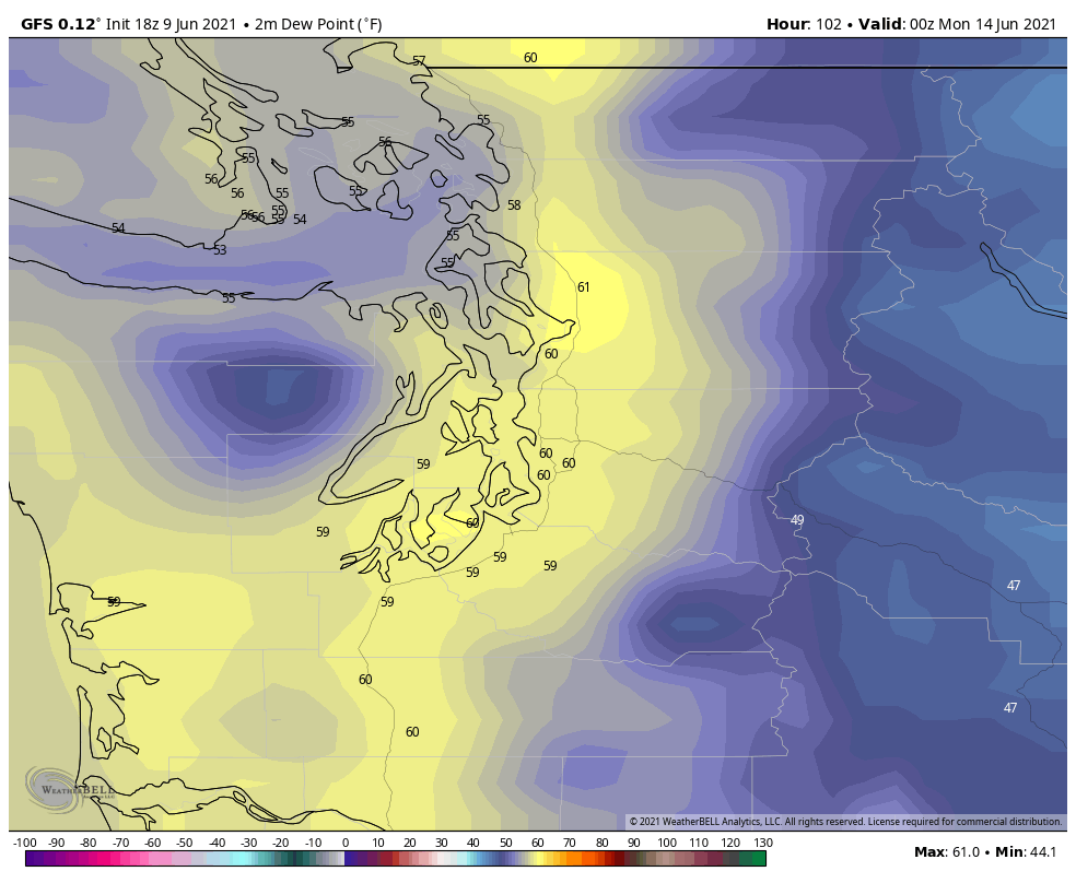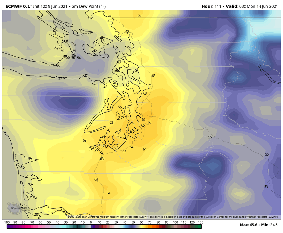 In comparison, the AVERAGE hourly dew point in Miami, FL is 67 F, for the entire year. So if Sunday feels humid to you in the PNW, I recommend never moving to Florida, or anywhere in the Southeast US for that matter.