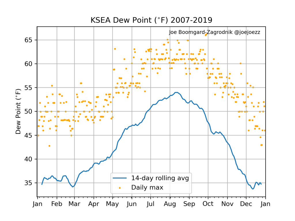 Despite its rainy winters, Seattle isn’t known for oppressive humidity. The relatively cool sea surface temperatures of the northeast Pacific tend to keep moisture levels lower than most of the continental US east of the Rockies. As a result, the populace has a low tolerance for muggy weather. When I googled “dew point comfort scale” it returned this approximate chart from WSEE out of Erie, Pennsylvania:
