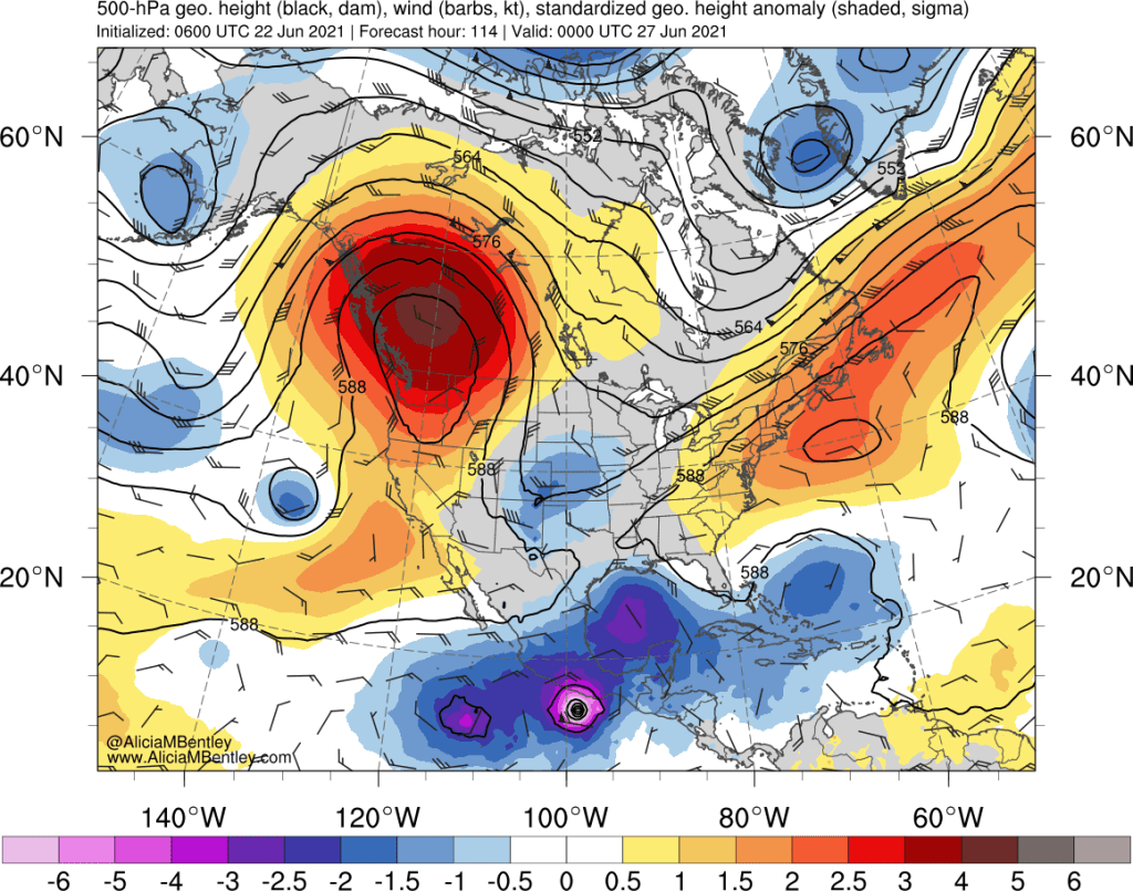 An extraordinary heat wave will build over the Pacific Northwest and British Columbia this weekend, bringing some of the warmest recorded temperatures in the history of the region. The upper-level forecast for Saturday evening shows an extraordinary “heat dome” ridge centered over western North America.