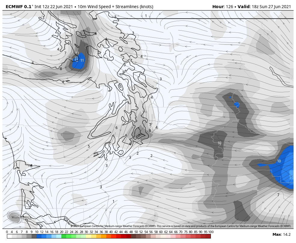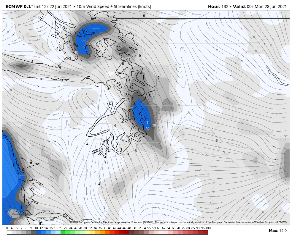 The forecast for Sunday is especially difficult. The ECMWF surface wind streamlines at 11 AM Sunday morning show a hot, easterly flow over the Cascades and south Sound, while westerly flow dominates over the north Sound.