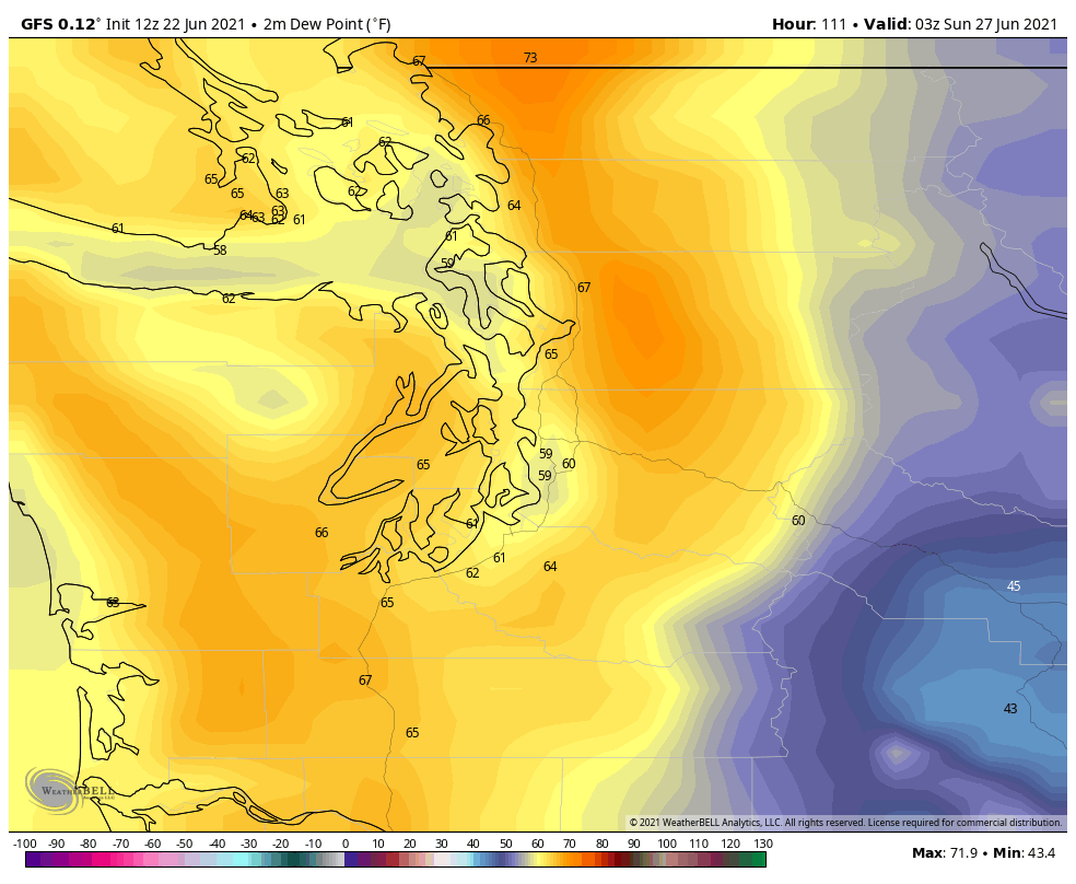 Temperature forecasting in a region of mountains and bodies of water is already tricky, but it is especially difficult during an extreme event in early summer following a period of appreciable rainfall. The added evapotranspiration from our lush June foliage will send dew points soaring to around 60 (GFS — image below) and potentially up to the mid-60s if you believe the more extreme ECMWF model (not pictured).