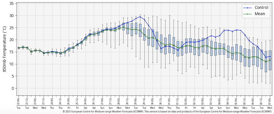 The forecast ECMWF ensemble mean at the sounding location (KUIL — Quillayute) is currently 25 C on the nose for the 00 UTC balloon launch on Sunday evening, although some of the operational forecast runs have suggested that 26-28 C is within the realm of possibilities.