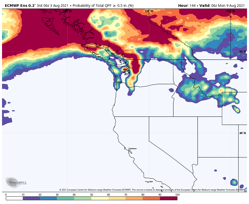 The latest European ensemble shows a >90% chance of 0.5″ of rain or more in the central and northern Cascades, as well as a greater than 50% chance of 0.5″+ of rain in the usual convergence zone area north of Seattle. Rain chances are also quite high in British Columbia which is great news for the wildfire situation to our north.