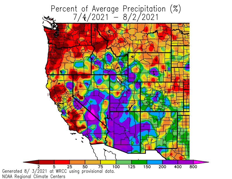 To go along with the heat, precipitation has been well below normal across the PNW and northern Rockies. Seattle and Portland both recorded zero precipitation in July with minimal precipitation across the rest of Washington State. A stronger-than-normal monsoon season has brought much-needed rainfall to the Southwest US.