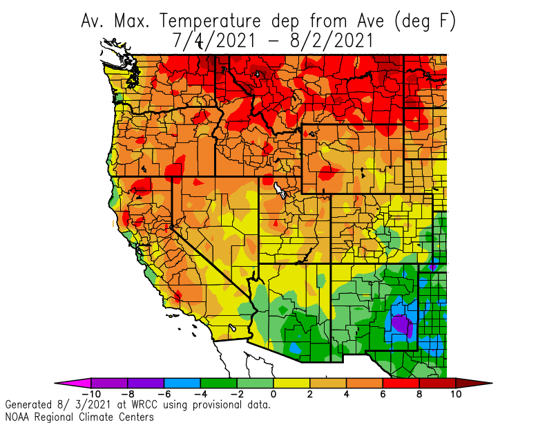 In contrast, Spokane experienced 15 straight days above normal to begin July and finished the month 6.5°F above normal.
