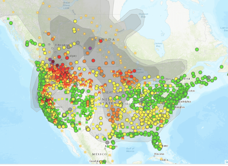 Not surprisingly, wildfire activity is strongly correlated with the driest areas. The map below, a capture of fire.airnow.gov on August 3, shows numerous fires in the interior PNW pushing smoke (gray shades) with reduced air quality (gray shades) across a large portion of the central US.