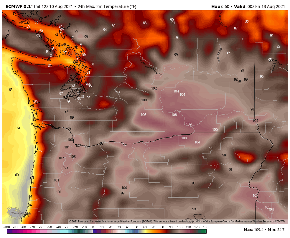 Looking at the latest ECMWF ensemble for Seattle, low 90s are likely on Thursday with mid-to-upper-90s on Friday. A few ensemble members have 100+°F on Friday, but fortunately it looks like Sea-Tac will mostly likely stay in the 90s.
