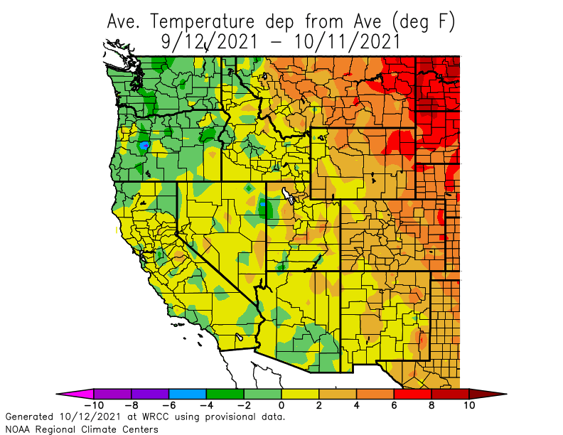 Over the past 30 days, average temperatures are running around 2°F below normal across most of Washington and Oregon.