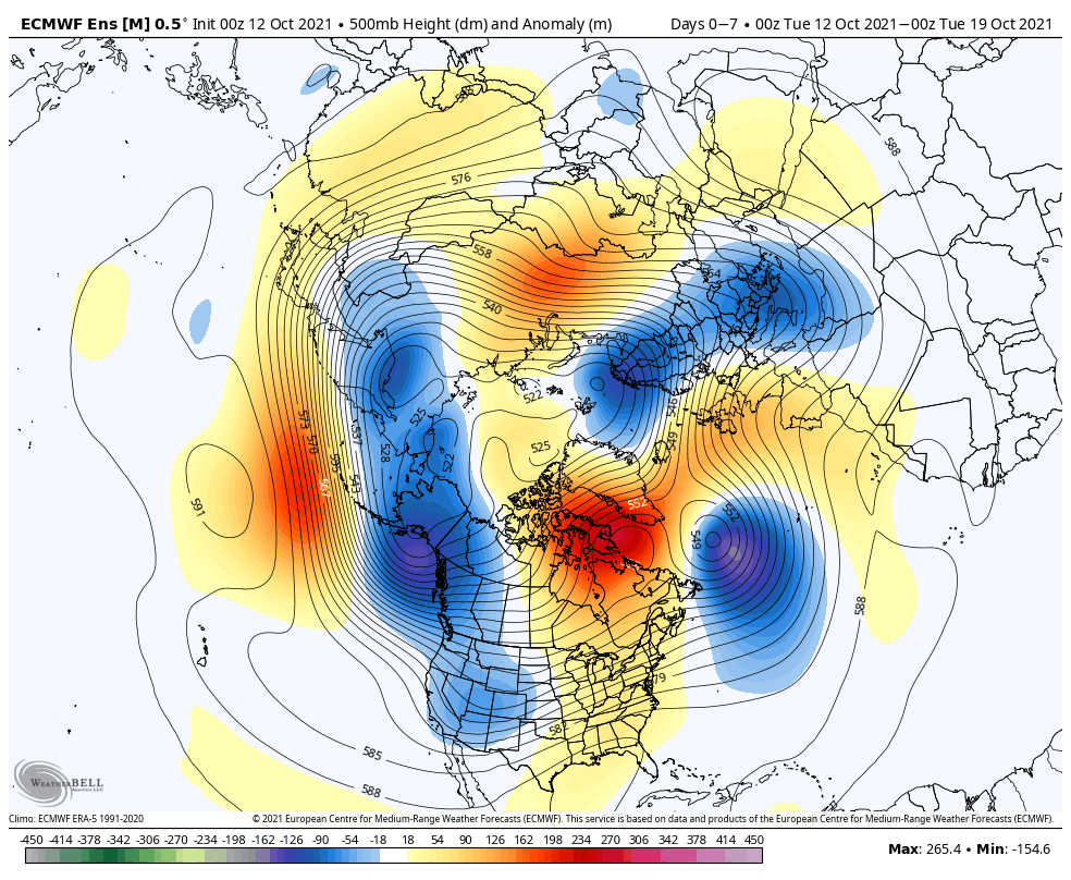 The ECMWF ensemble mean 500 hPa heights for the next week (Oct 12-19) show a ridge centered north of Quebec flanked by two troughs. Most relevant to our region is continued troughing over BC and the Gulf of Alaska as well.