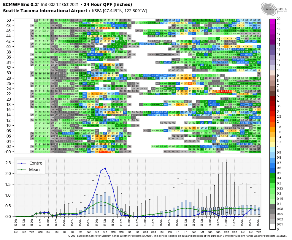 The ECMWF ensemble 24-hour precipitation members for Sea-Tac show significant uncertainty. The ensemble members have yet to reach consensus on a potentially significant storm this weekend, much less any future action the following week. Although generally all indications are that wet weather will return after only a brief respite during the middle of next week.