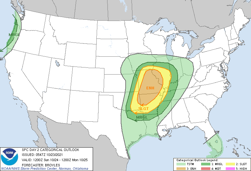 The combination of instability from cold air aloft and low-level wind shear (i.e. changing wind directions with height) will bring a chance of organized thunderstorms to the coast around on Sunday afternoon. The Storm Prediction Center (SPC) is predicting a marginal risk of severe weather (primarily hail).
