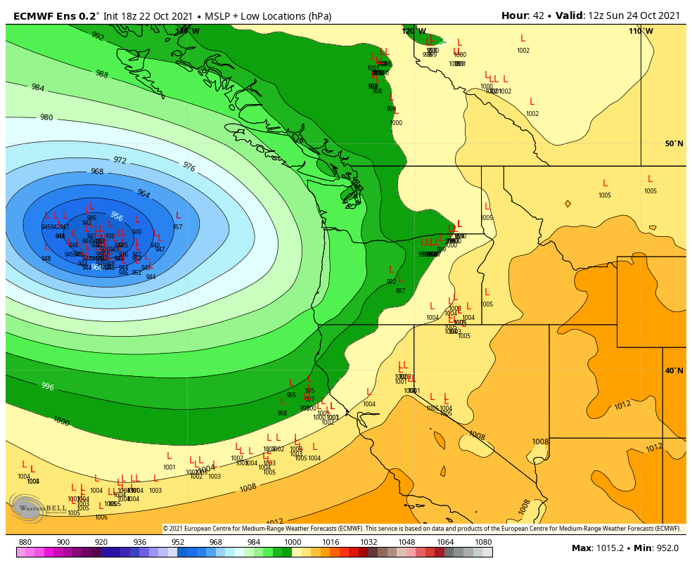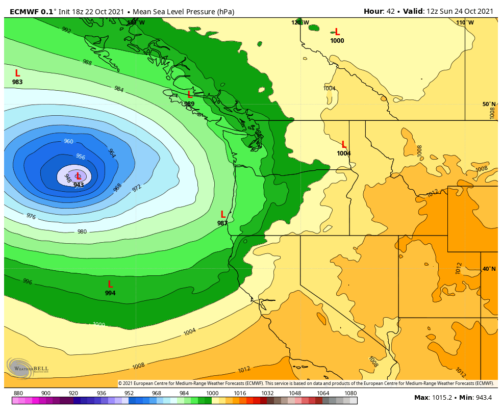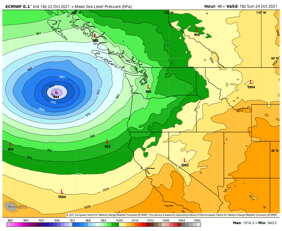 Model forecasts of sea-level pressure are even lower than the first bomb cyclone on Friday. The latest deterministic ECMWF run predicts a 943 hPa center on Sunday morning. The GFS predicts 945 hPa.