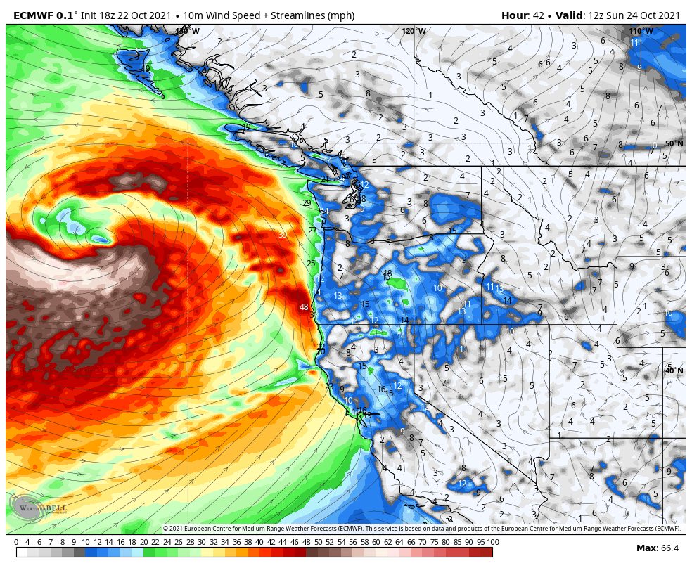 The strong wind and waves will reach the Washington coastline late on Sunday evening. The NWS is currently predicting sustained winds of 40 mph at the coast with gusts to 60 mph. NOAA’s forecast for the coastal waters shows seas up to 30 ft on Sunday night.