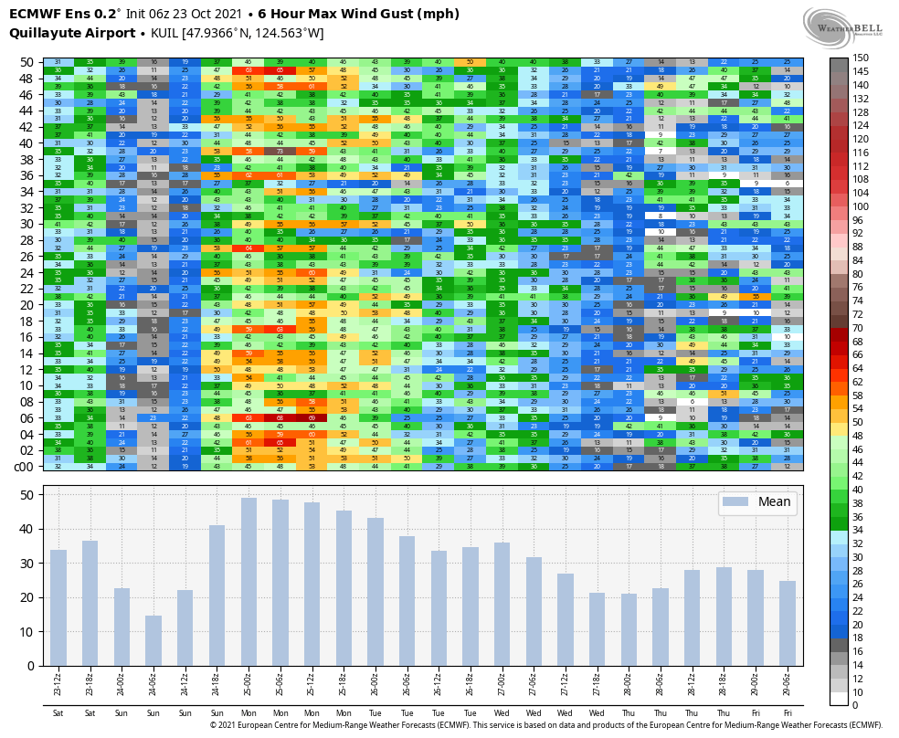 What about the coast? Wind gusts up to 50 mph are expected at Quillayute airport on the Olympic Peninsula, although a few ECMWF emsemble members show gusts above 60 mph. Quillayute airport is a few miles inland, so expect even stronger wind gusts directly at the coast.