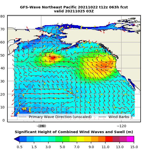 The long fetch of strong winds to the south of the low will generate an impressive surf. Wave heights will approach 10 m (30 ft) in the open ocean on Sunday evening.
