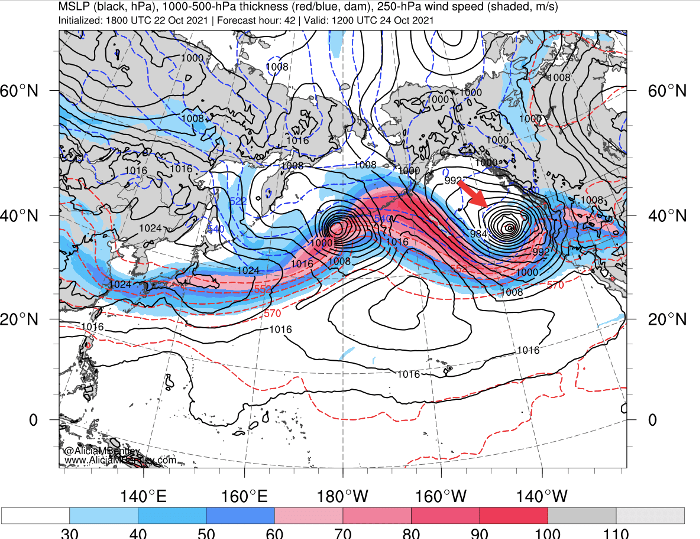Let’s start by examining the evolution on the large scale using maps of the jet stream (250 hPa wind) and sea-level pressure. The origin of this cyclone is a wave along a robust, zonal (west-east orientated) jet stream. As of Saturday morning it will be around 155°W.