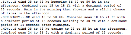 The winds will be especially impressive over the open ocean near the low pressure center, sustained in the 50-70 mph range.