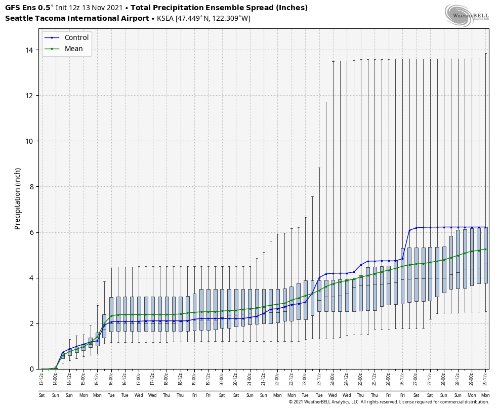 The error bars on the ECMWF precipitation forecast for Sea-Tac tell the story. The ensemble members are in fairly good agreement through Sunday afternoon. After that, the error bars show an ensemble mean of around 3 inches (still a significant rainfall event!) but the control run and some individual members are in the 4-6 inch range.