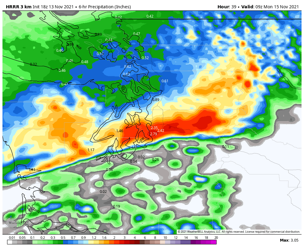 The rain band is expected to have a sharp southern cutoff on Sunday evening. If the HRRR is correct, the 6-hour precipitation totals (ending 1 AM Monday) will be significant, with a ~10 mile wide band of 2-3 inches of rain in a short period of time.