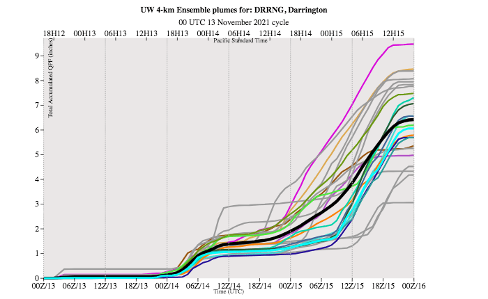 What about farther north? Here’s the UW-WRF ensemble plume for Darrington in Snohomish County. The ensemble mean is 6 inches of rain!