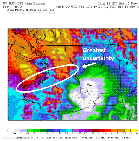 The area of greatest uncertainty is highlighted below in the latest UW-WRF total precipitation forecast. This map represents the more northern track, which would result in only an inch or inch and a half of rainfall around Seattle.