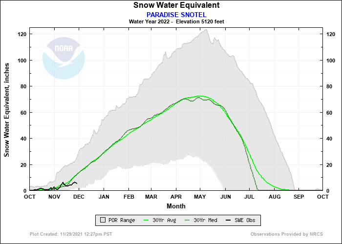 The good news is that there is plenty of time to catch up. Paradise on Mt. Rainer currently has around 5 inches of snow water equivalent (SWE) compared with a long-term normal of 12 inches. A 7-inch deficit can be erased in a couple of storms.