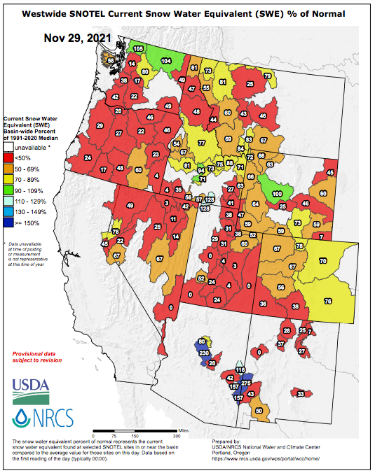 November precipitation was well above average in most of the PNW, especially Washington State, but the rest of the western US had a relatively dry month.