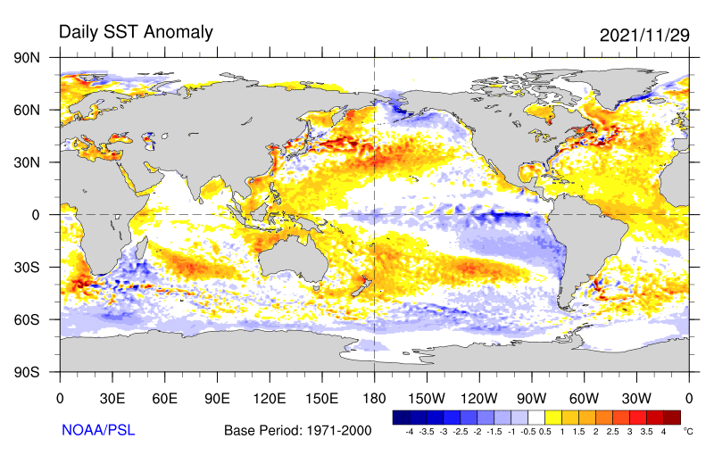 The SST anomaly pattern continues to indicate a strengthening La Niña in the equatorial Pacific. Additionally, a region of colder-than-normal SSTs has formed off the coast of Alaska and BC.