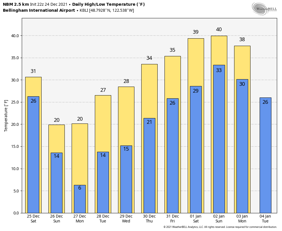 The NBM forecast for Bellingham airport is more impressive — a low of 6 °F on Monday morning.