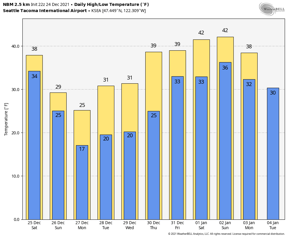With fresh snow on the ground, Monday morning is likely to be the coldest of the period. The NOAA NBM statistical model shows a low of 17°F and a high of only 25°F for Sea-Tac on Monday. That would be the coldest at Sea-Tac since a low of 14°F in November 2010.