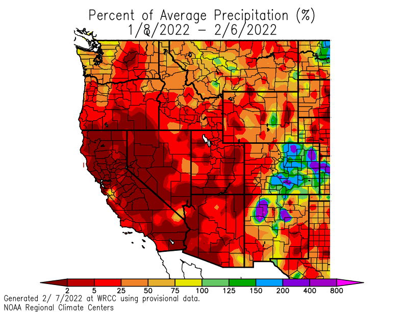 Precipitation over the past month has been below average across most of the west, with the worst anomalies in California.