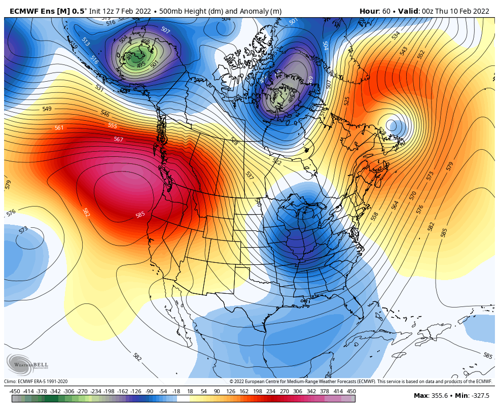 After losing a bit of amplitude over the weekend, the ridge will re-establish itself by the middle of next week. Here’s the ECMWF ensemble mean height anomaly forecast for Wednesday evening February 16, one week after the forecast that I showed above.