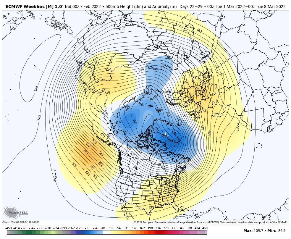 Is this evolution showing up in the models? Here’s the weekly height anomaly forecast for the last week of February from the ECMWF weeklies.