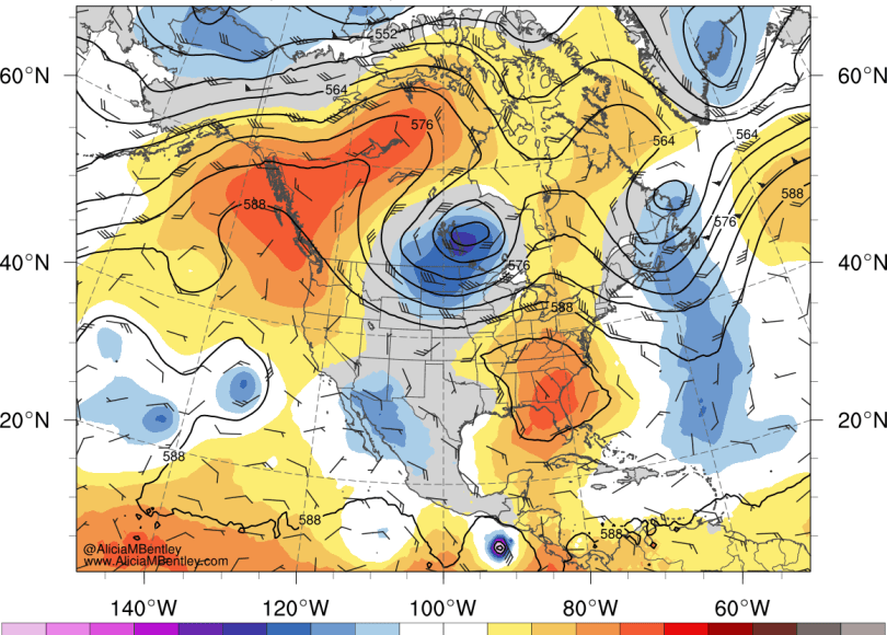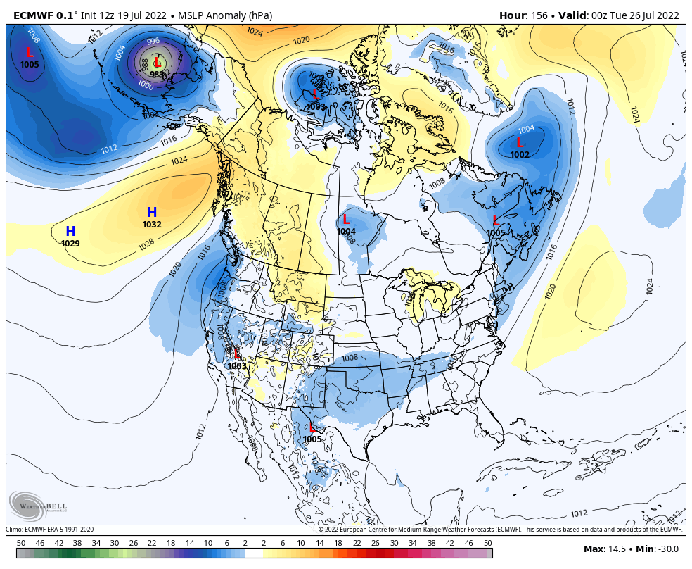 In contrast, the GFS has a weaker high pressure anomaly over Montana/Alberta and a much stronger high pressure anomaly over the NE Pacific. There is still a thermal trough signature but it isn’t as distinct as the ECMWF forecast.